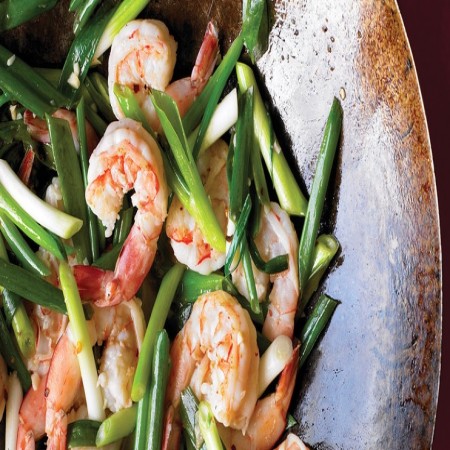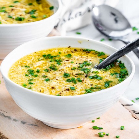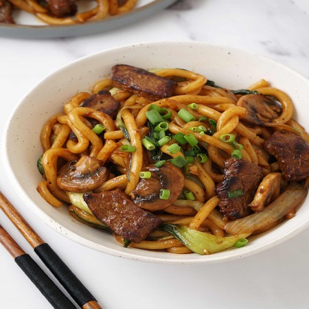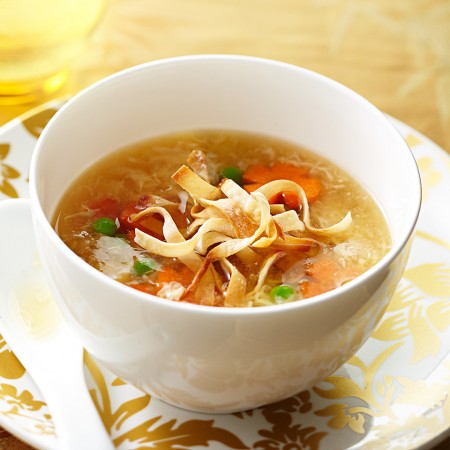 Wheat flour noodles with egg, onions, and fried scallions.