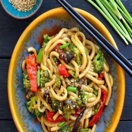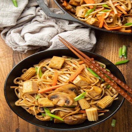 Egg noodles with mixed vegetables and bean sprouts.