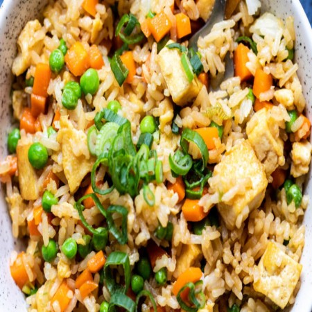 Rice stir fried with egg, bean sprouts, and mixed vegetables.