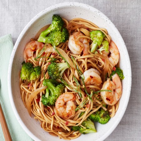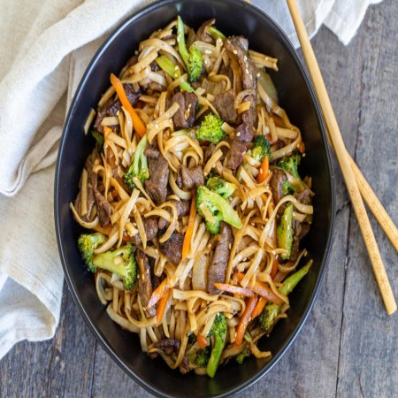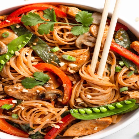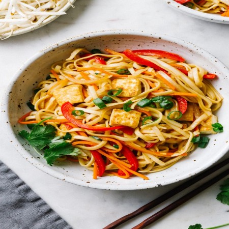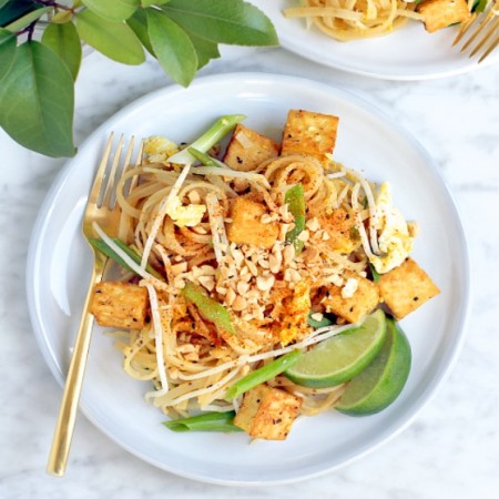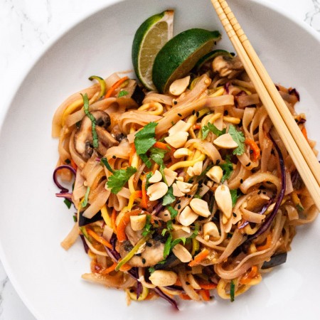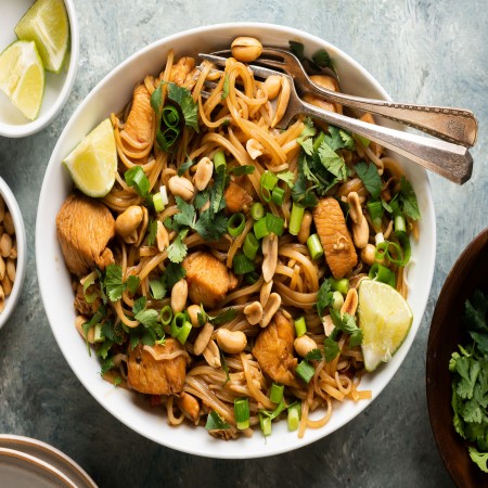 Rice noodles cooked in hot oil and fish sauce with peanuts, cabbage, bean sprouts, and lime.
